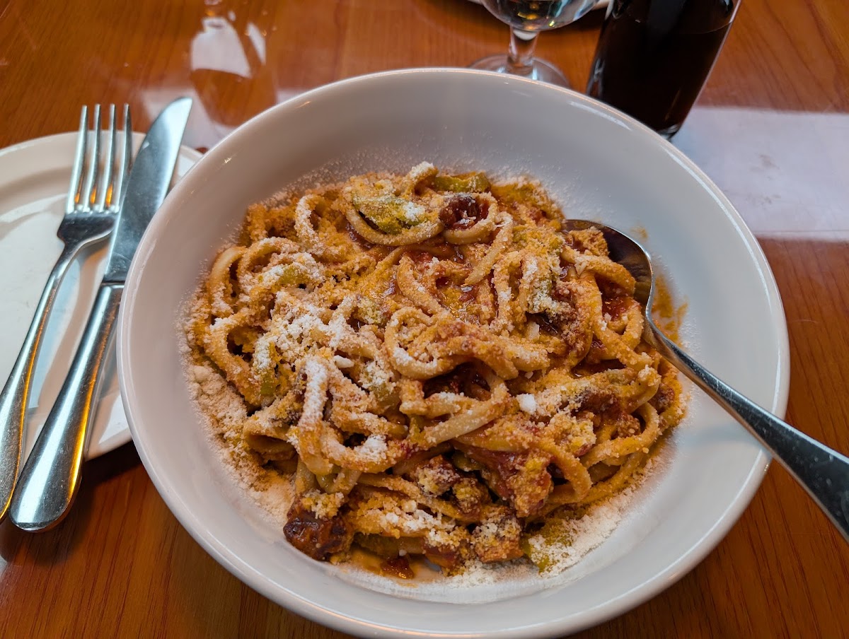 We dined here for the first time after a recommendation from friends and enjoyed our food. The place is very small, maybe 12-15 tables depending on how they configure it (2 person tables or larger parties?). The fried pizza dough appetizer is outstanding and the bucatini pasta with the bacon like meat sauce is so good but spicy! The portions are quite large so with appetizers, I would recommend splitting a main entrée. Can't wait to come back soon!